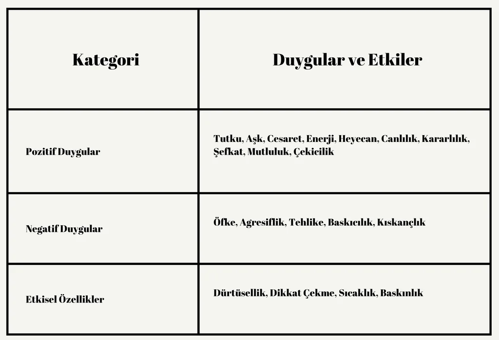 Kırmızı, farklı durumlarda hem olumlu hem de olumsuz duyguları ifade edebilir. Kırmızı rengin temsil ettiği bazı duyguların ve etkilerinin tablosunu aşağıda bulabilirsiniz: